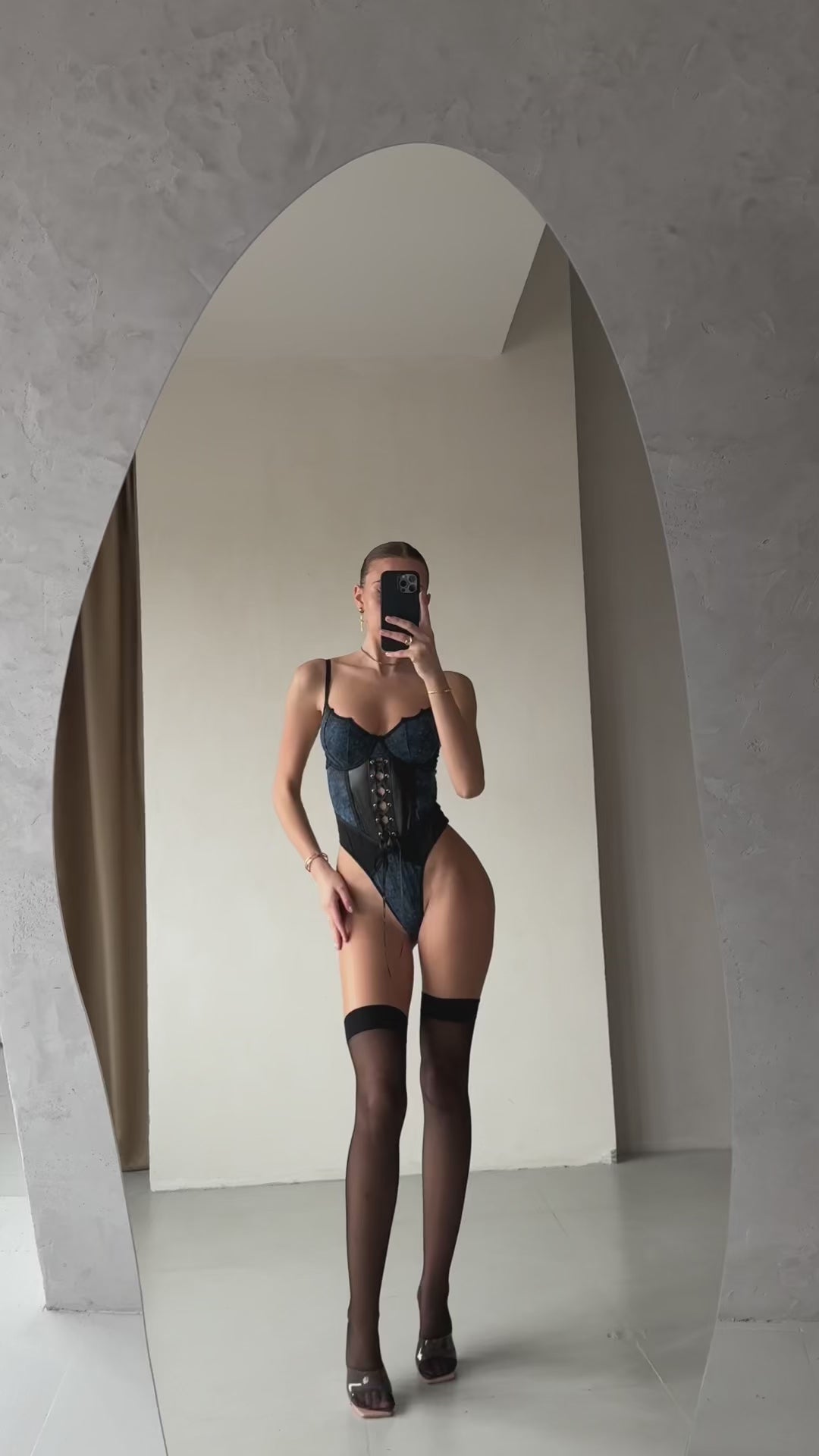 Dramatic corset-style bodysuit that merges sophistication with seduction. Structured underwire cups to lift and define the bust. C black faux-leather accents adding bold edge to a classic silhouette. Adjustable shoulder straps for comfort and support.